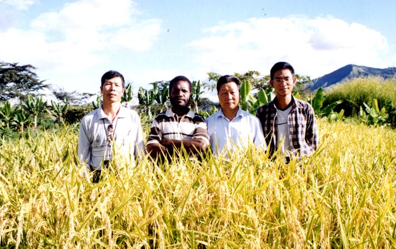 2002年,在巴布亚新几内亚,专家组指导农户进行旱稻生产。左一为林占森,右二为林占熺教授。