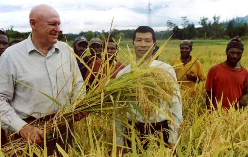 2003年,在巴布亚新几内亚,林占森(前排右一)陪同东高地省领导视察农户旱稻。