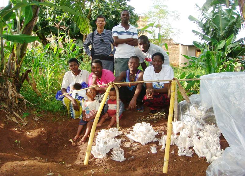 2010年,林占森(后排左一)在卢旺达的布塔雷市孤儿院指导种植菌草菇。
