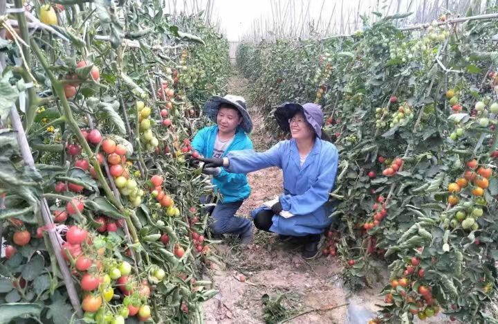 福建省援宁科技特派员张前荣与宁夏农林科学院园艺研究所副研究员赵云霞观察番茄植株长势和特性。图源:福建省农业科学院
