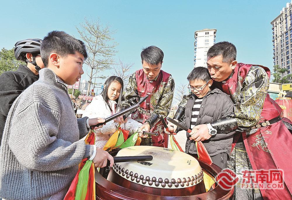 图为小朋友体验非遗“太平鼓”。