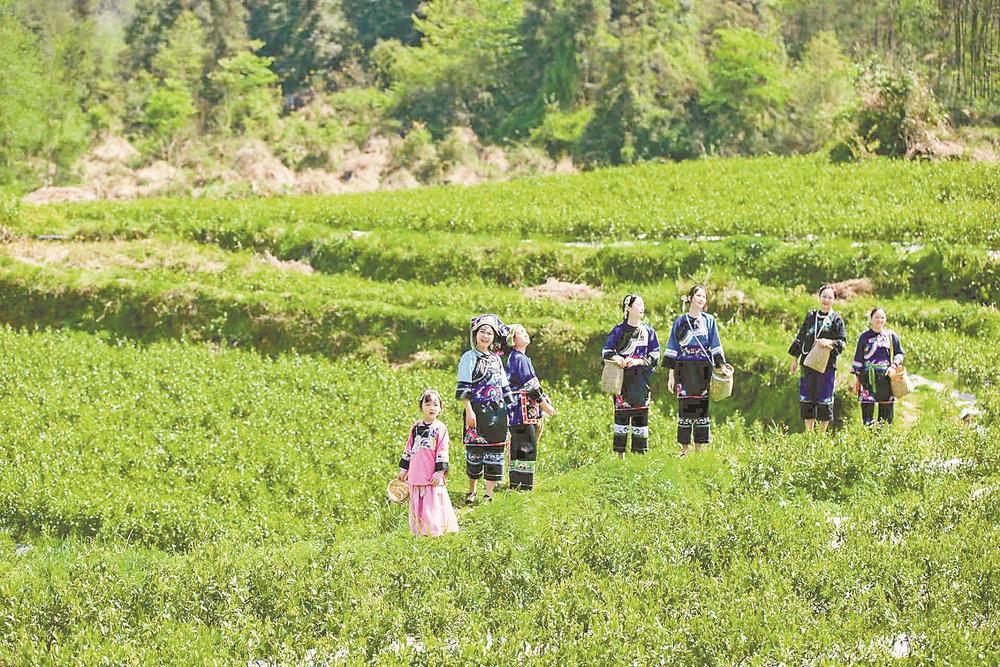 踏上乡村振兴新征程,石栏镇积极探索“非遗+农业+旅游”融合发展之路。在全国人大代表、返乡创业能人石佳的带动下,绣娘们开荒种茶,在石栏镇油麻村开辟出“七绣姑娘的茶山”。