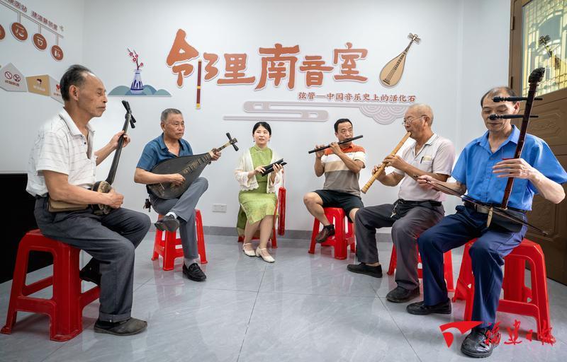 在永春县介福乡紫美村“党建+”邻里中心邻里南音室内,大家在一起弹唱南音。康庆平 摄