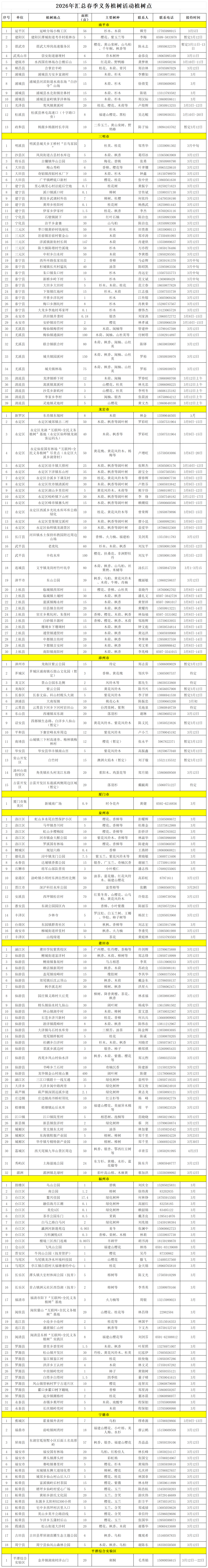 近日,福建省绿化委员会办公室正式公布了2026年春季义务植树点相关信息,此次共确定义务植树点198个,认建认养林木和绿地118处(可供认建认养的林木达6.56万株,绿地面积为109.25万平方米)。