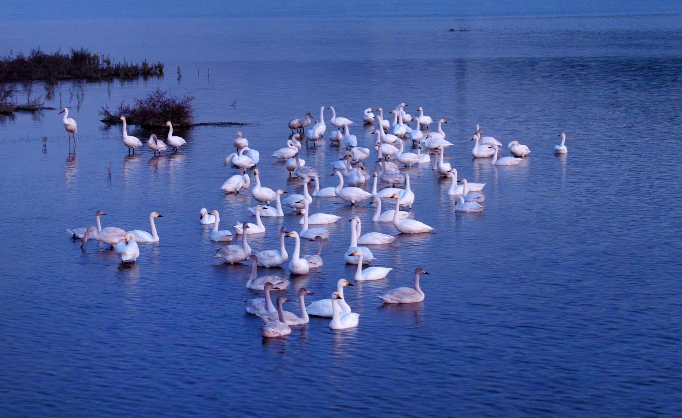 小天鹅在水清岸绿的崇阳溪水面上栖息嬉戏。(黄杰敏 摄)