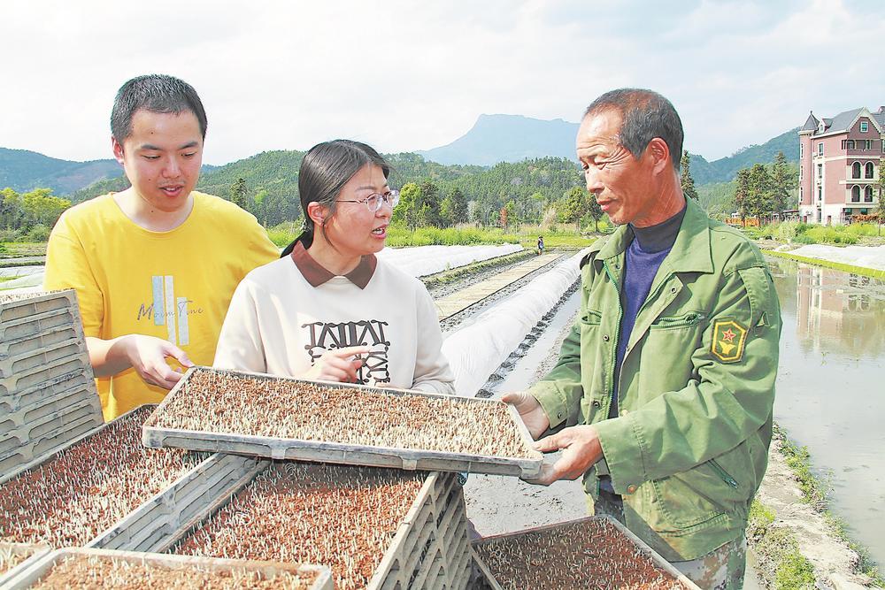 18日,顺昌县气象局组织工作人员深入田间地头,服务春耕春播,为粮食稳产增收筑牢气象防线。图为顺昌县气象局技术人员在元坑镇谟武村田间查看秧苗长势,为进行育秧作业的农民提供气象咨询服务,并提出生产建议与防御措施。陈柏材 蔡元康 摄
