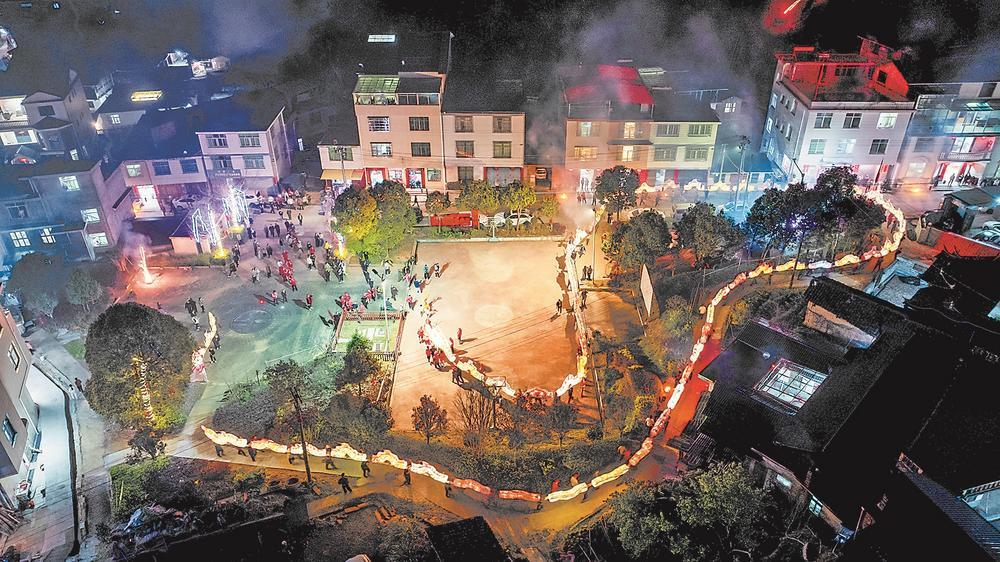 19日晚6时许,山村灯火渐次亮起。伴随着震耳的爆竹声和绚烂绽放的烟花,一条长达260余米、由58节龙灯连接而成的长龙在村中蜿蜒而起。青壮年村民扛着长龙,在古村巷道中穿梭游弋,龙身随着步伐起伏翻腾,在夜色中流光溢彩(右图)。