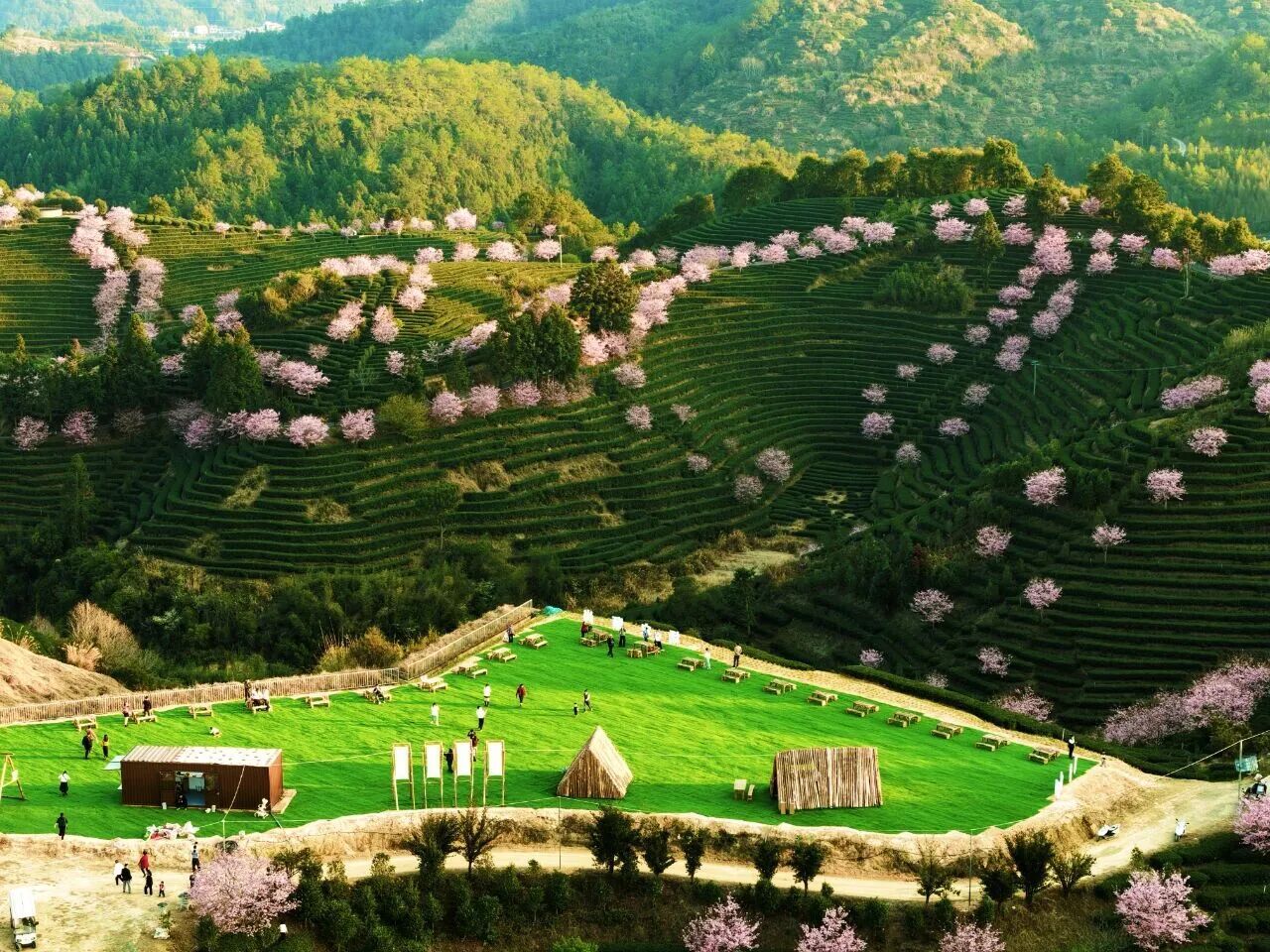 仲春时节,武夷山燕子窠生态茶园里满目皆绿,立樱花树下,望远山如黛,犹如走进桃花源。