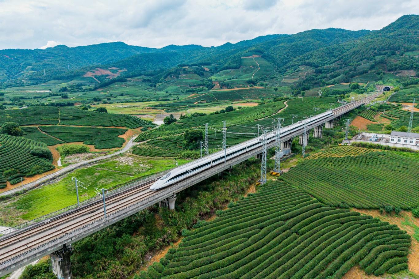 合福高铁从武夷山的翠绿茶园旁疾驰而过(陈天博 摄)