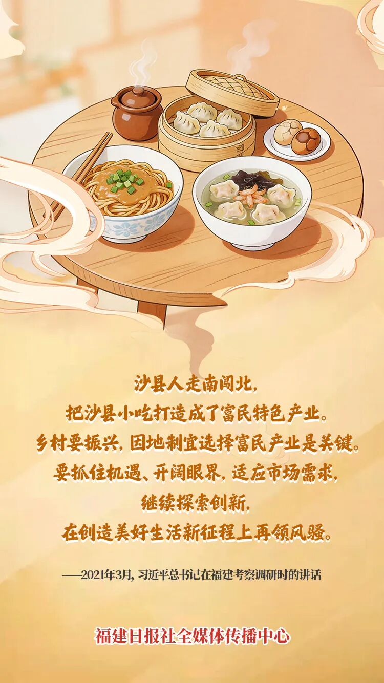 2021年3月23日,习近平总书记来到三明沙县夏茂镇俞邦村,同乡亲们亲切交谈,实地了解沙县小吃发展现状和前景,鼓励大家再接再厉,继续引领风骚!