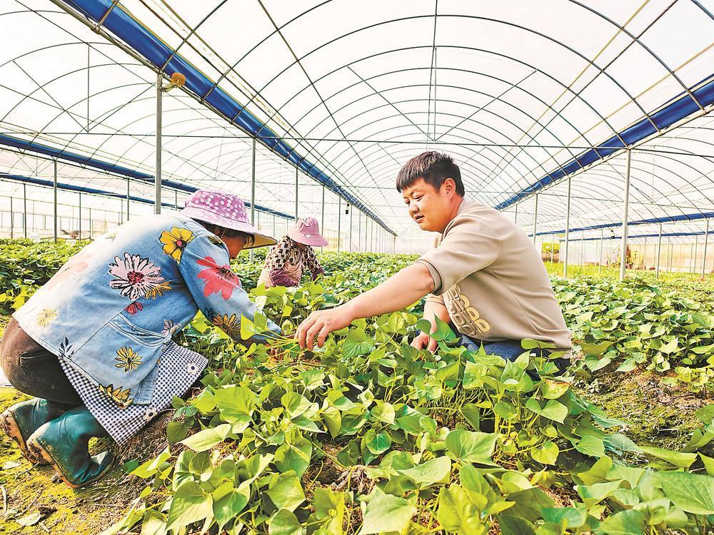 连城县一处蔬菜大棚内,农户在管护新品种甘薯。黄水林 摄