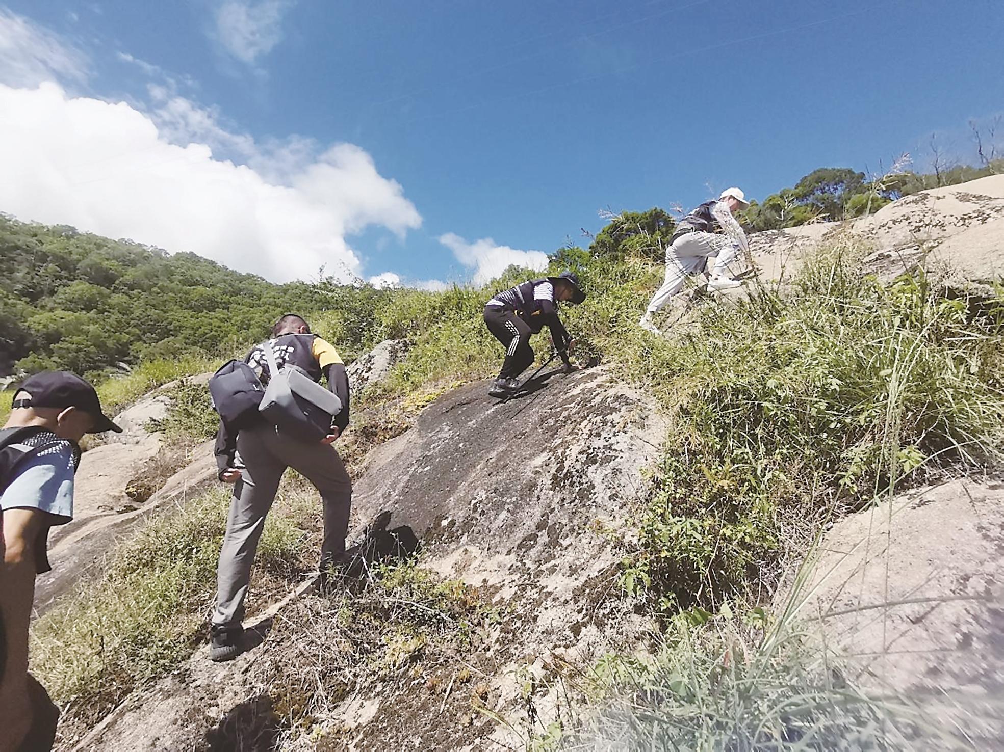 霞浦县普查队队员攀越石坡,前往桃城古堡普查。