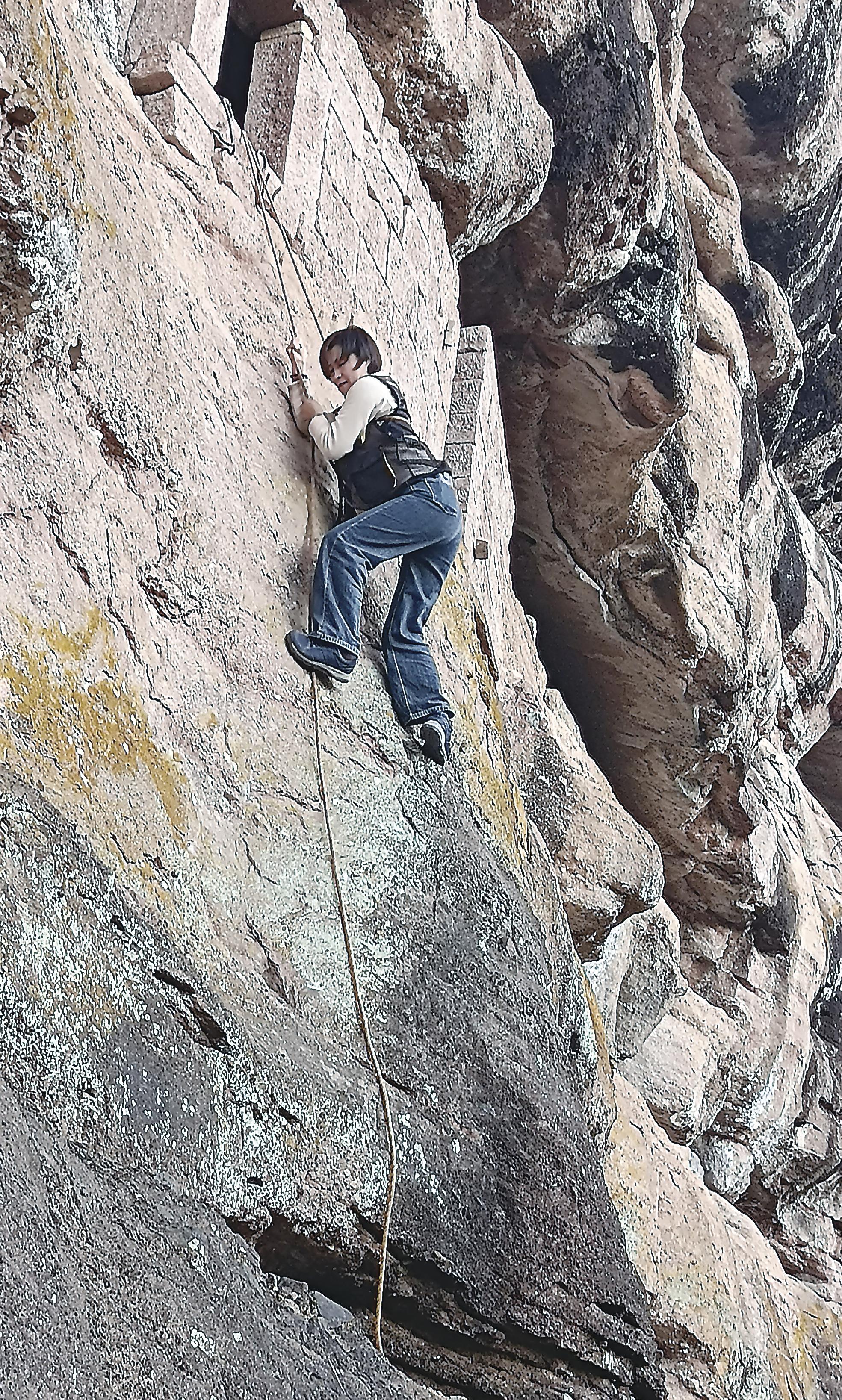 在金鸡山古崖洞开展野外调查时,武夷山市普查队分队长逄博如吊着绳索攀登悬崖。