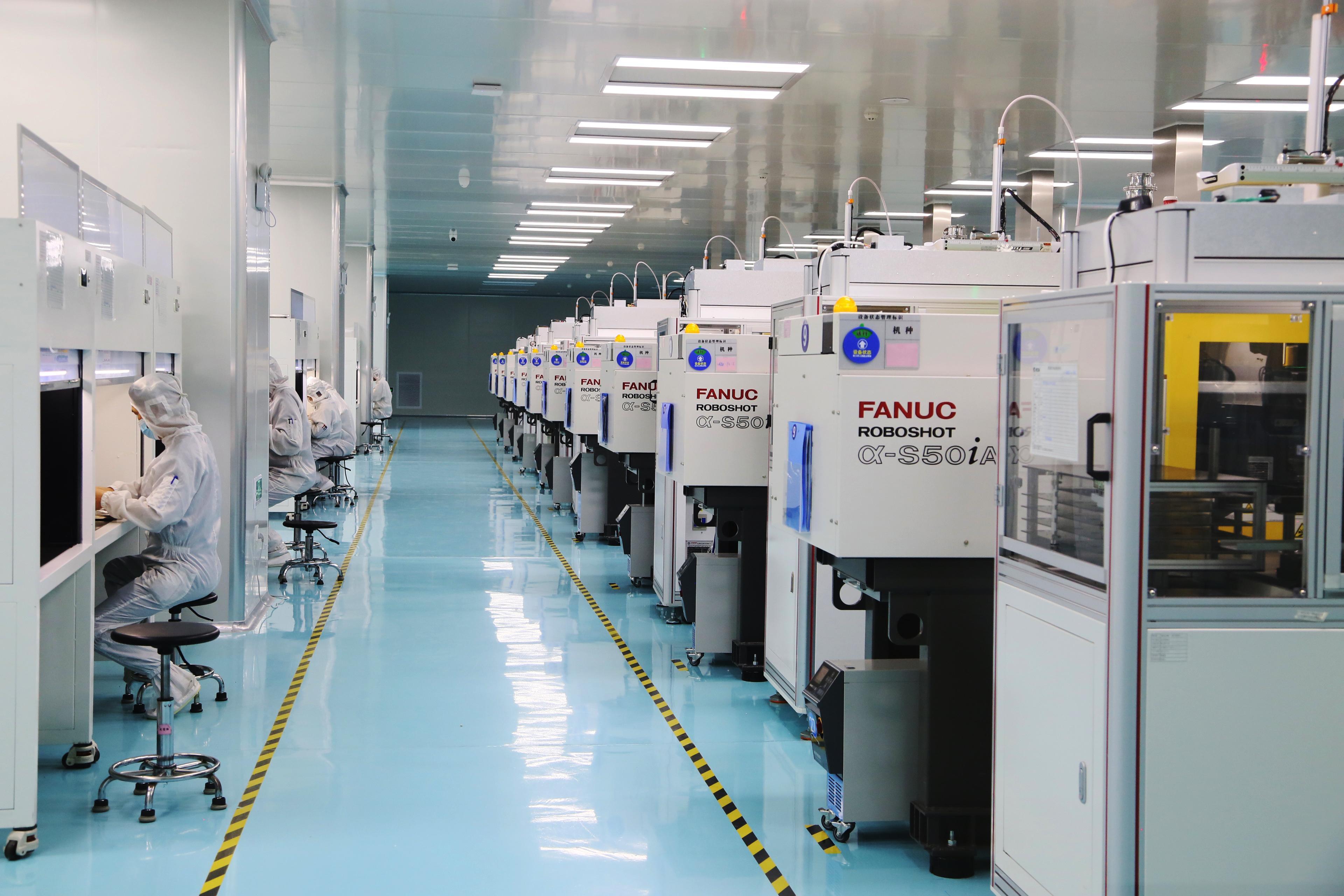 在福光股份注塑成型车间内,技术人员专注作业。(福光股份供图)