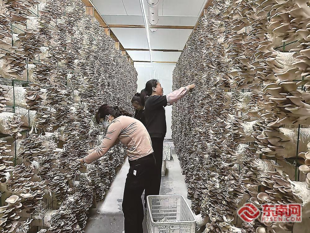近日,大田县均溪镇周田村智慧食用菌生产基地迎来头茬秀珍菇集中采摘季,鲜菇经工人分拣装箱后将直供上海批发市场。