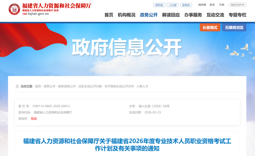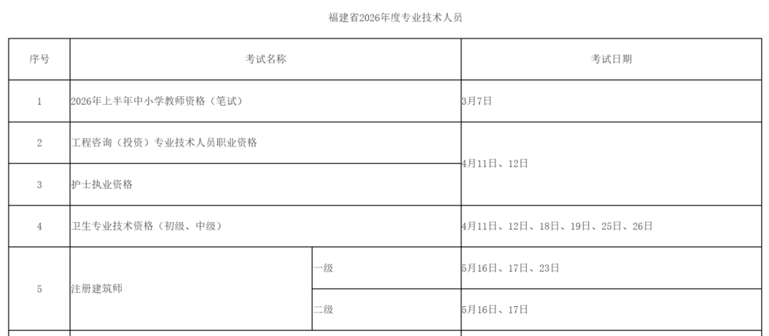 为做好专业技术人员职业资格考试规划和管理工作,便于广大专业技术人员参加职业资格考试,根据人力资源社会保障部办公厅《关于2026年度专业技术人员职业资格考试工作计划及有关事项的通知》(人社厅函〔2026〕6号)精神,结合我省实际,经商有关部门同意,现就福建省2026年度专业技术人员职业资格考试工作计划及有关事项通知如下:
