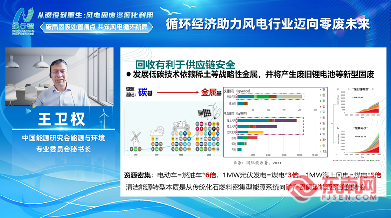 中国能源研究会能源与环境专业委员会秘书长王卫权紧扣“双碳”目标与循环经济理念,深入剖析了风电产业全生命周期零废发展的实现路径,为行业补齐末端治理短板、实现全流程低碳化指明了方向。
