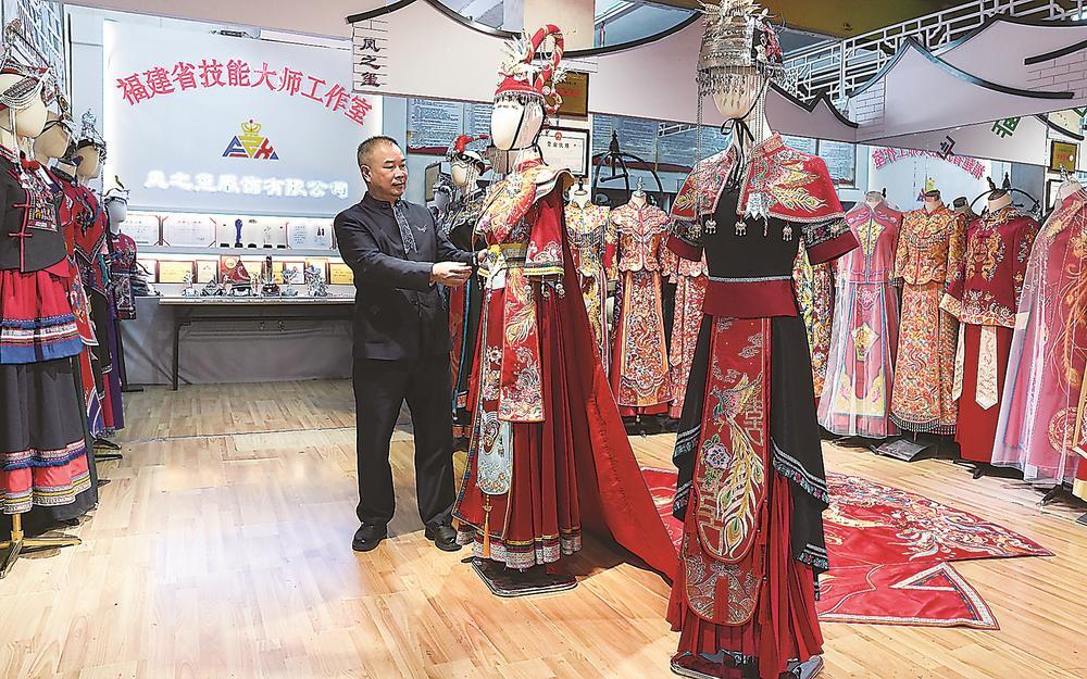 自那之后,钟桂梅开始将更多精力倾注到畲族服饰制作中,工作室陈列的一套套新型畲族服饰便是最好见证。这些年,她的手艺愈发精湛,能娴熟运用几十种针法和色线,将凤鸟、花卉等畲族经典图案绣入服饰,让每一套畲服都拥有独特的纹饰与质感。