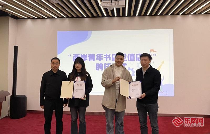 福建省台湾同胞联谊会党组书记刘良辉、海峡出版发行集团党委副书记黄辉昌为首批即将担任“两岸青年书店轮值店长”的台湾学生陈子砚、谢依庭颁发聘书。首批轮值店长将在一个月任期内,围绕两岸文化交流主题,自主策划并主导书店月度主题活动,深度参与空间运营与文化推广。