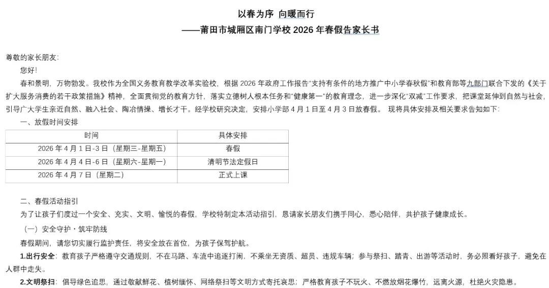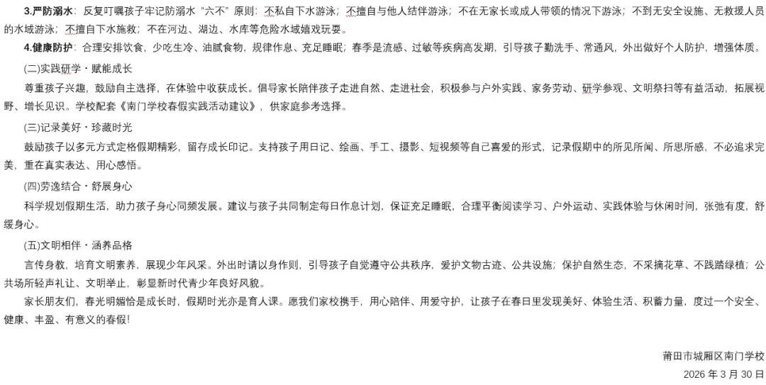 2026年政府工作报告明确提出“支持有条件的地方推广中小学春秋假”。作为全国义务教育教学改革实验校,南门学校肩负先行先试的责任与使命,此次推行春假,旨在打破传统课堂局限,让孩子们拥有更多时间接触自然、涵养品格、提升综合能力,真正回归教育育人的本质。