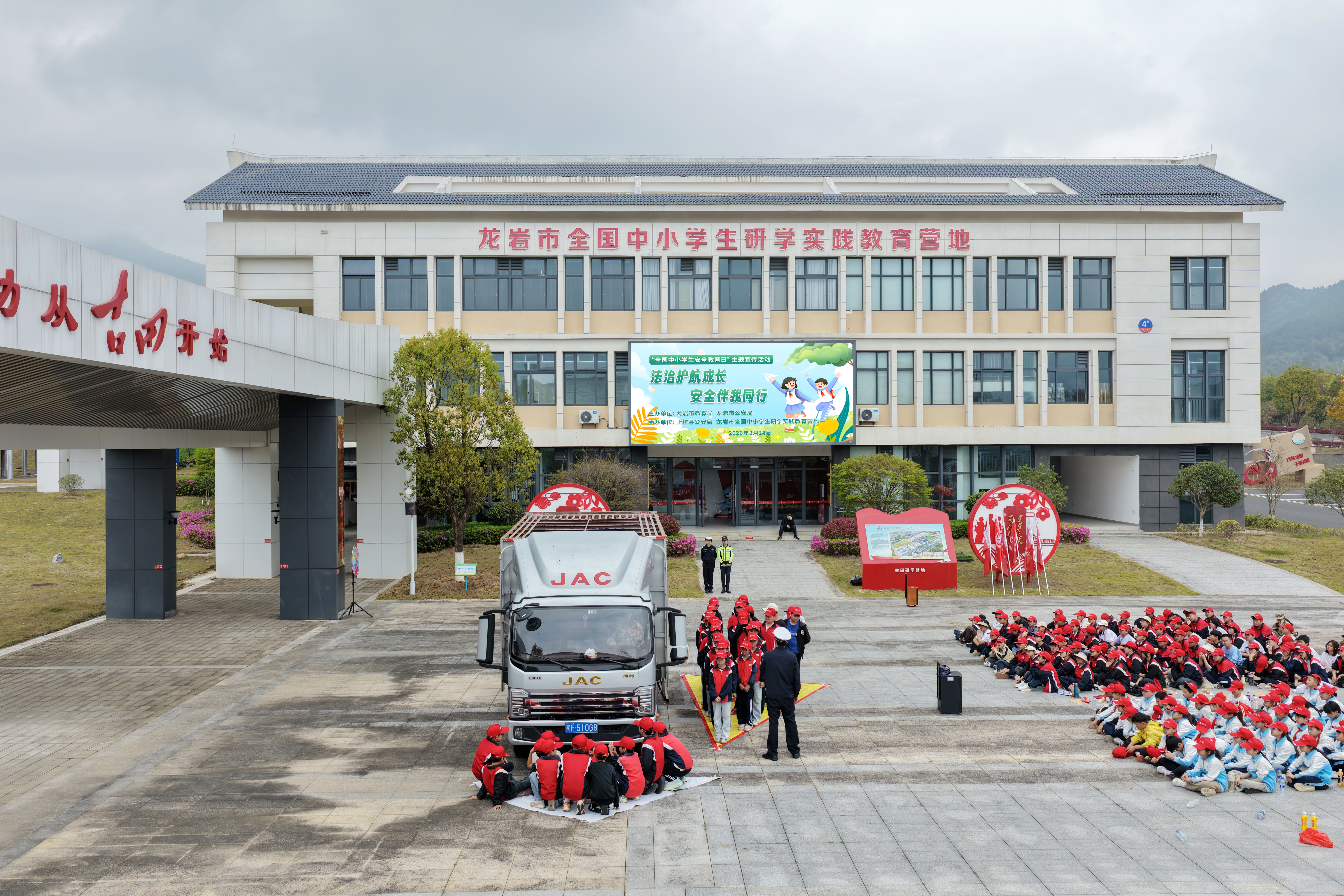 龙岩交警支队联动市公安局治安、刑侦等警种及市教育局,依托研学实践教育营地开展主题活动,采用“室内宣讲+户外体验”模式,普及交通安全、防校园欺凌等内容,通过大货车盲区展示、“鬼探头”演绎等体验,实现“法治+安全”教育深度融合。