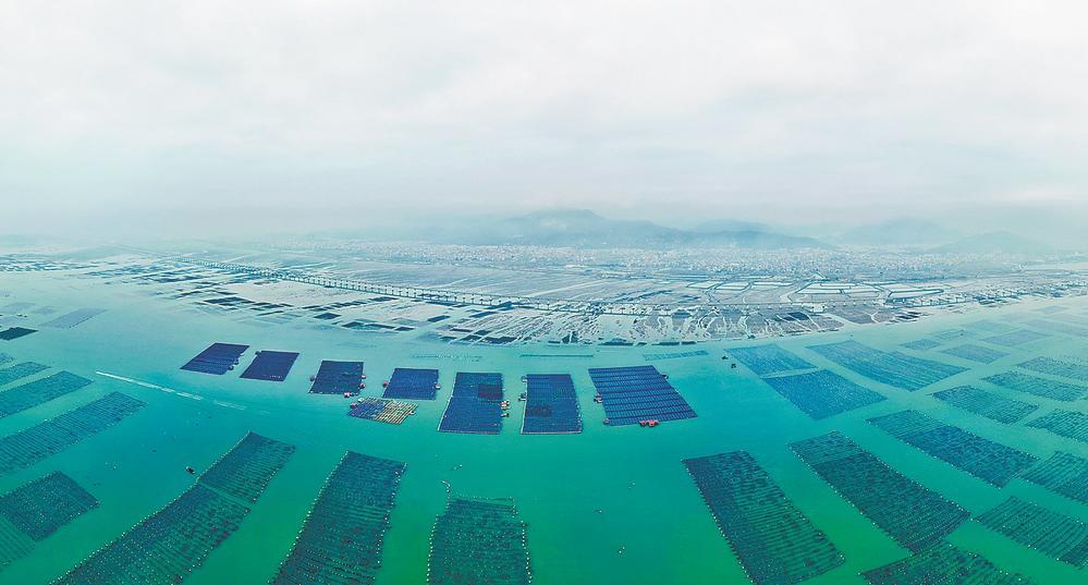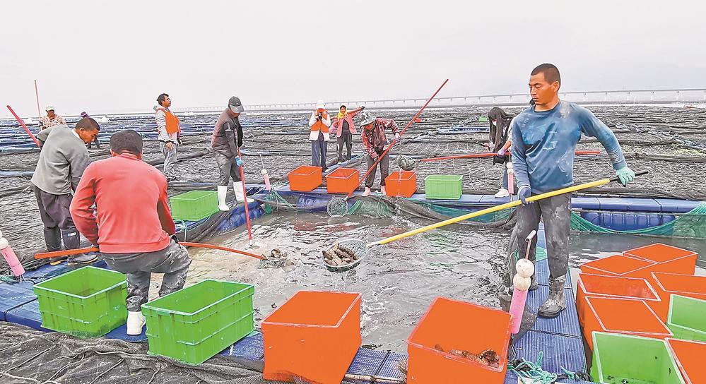 养殖工人从网箱中打捞海参。 陈盛钟 摄