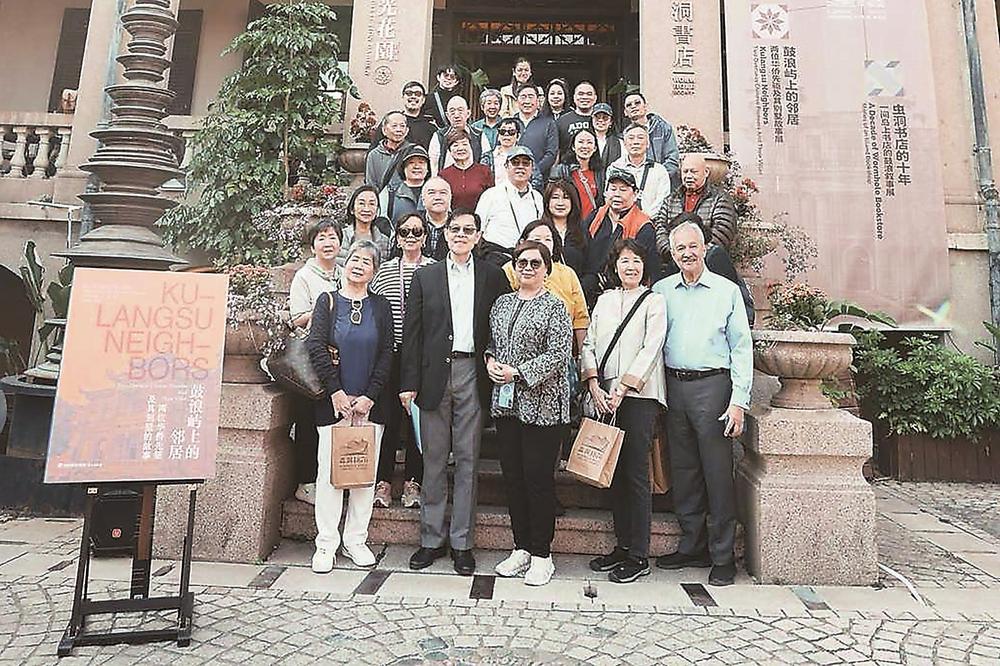 新书发布会现场,在鼓浪屿海天堂构别墅群内的虫洞书店前,罗伯特(前排左二)和世界各地的施、黄两族宗亲后裔合影留念。(受访者供图)