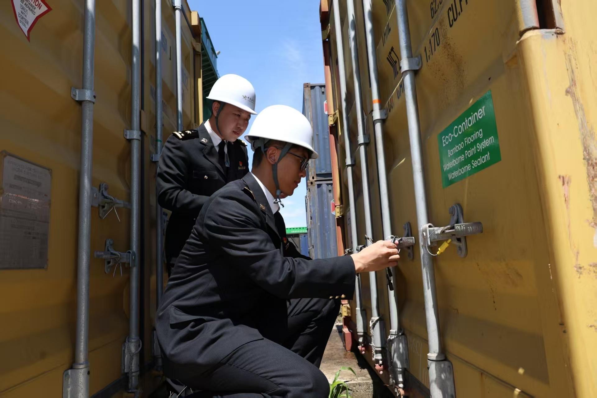 榕城海关驻福清办事处关员正在对福州首票海铁联运集装箱开展监管 张雨涵供图