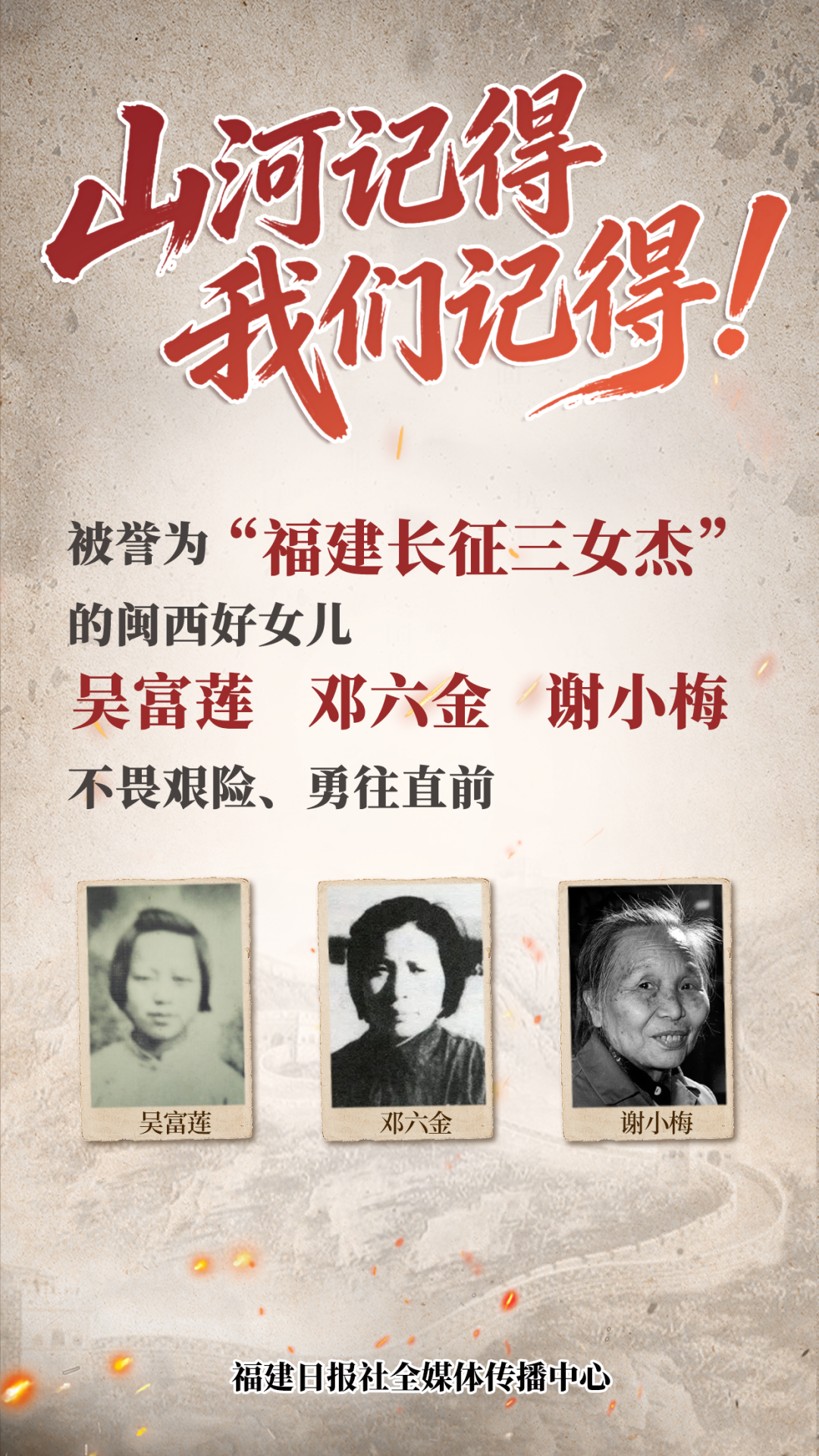 中央红军长征队伍屈指可数的30名女战士中,福建籍的有3名——邓六金、吴富莲、谢小梅。她们以惊人的勇气和毅力,克服了种种难以想象的困难,为红军长征谱写了富有传奇色彩的壮丽篇章。