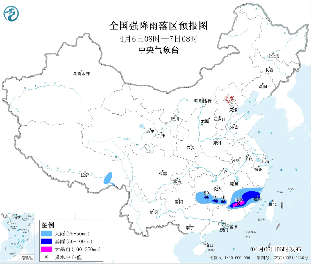 返程注意! 中央气象台4月6日06时 继续发布暴雨蓝色预警 预计,4月6日08时至7日08时 湖南南部、江西中南部 福建、广西北部、广东北部 以及西藏东南部等地部分地区 有大到暴雨