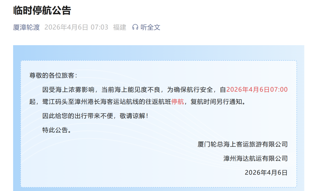 本次过程影响范围广,雨水波及全省,但分布不均匀,强降水落区主要集中在福建中部,局部达大暴雨的量级。在春季,强降水和强对流天气常常相伴而生,此次强对流天气具有混合型的特点,以短时强降水天气为主,局部或有(8-10级)雷暴大风和冰雹等天气。 厦漳轮渡发布停航公告 受海上浓雾影响 4月6日07:00起 鹭江码头至漳州港长海客运站航线的往返航班停航