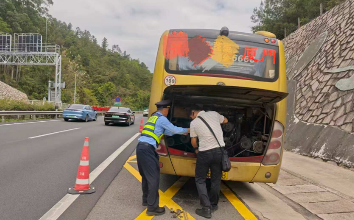10时42分,执法人员远远发现一辆打着双闪的大客车正沿着应急车道向驻点区域驶来,车辆后方还冒着浓烟。见状后,执法人员立即呼叫现场其他人员,有的赶紧扛起锥标、进行布控示警,指挥后方来车提前减速避让,有的拿来执勤车内的灭火器、做好扑救准备,有的配合驾驶员组织车内的所有乘客有序下车。经驾驶员介绍,途中因发动机冷却液不足、水温过高,再加上经过上坡路段,导致尾部机舱出现冒烟,所幸不是起火险情。