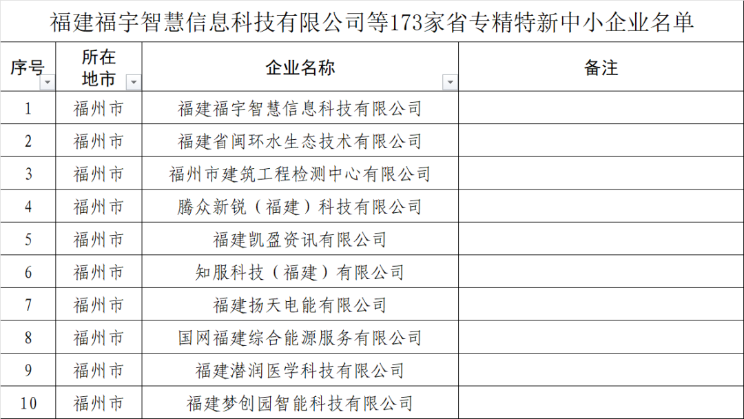 根据《福建省优质中小企业梯度培育管理实施细则》等有关规定,经研究,确定福建福宇智慧信息科技有限公司等173家企业为福建省专精特新中小企业,现予公布。