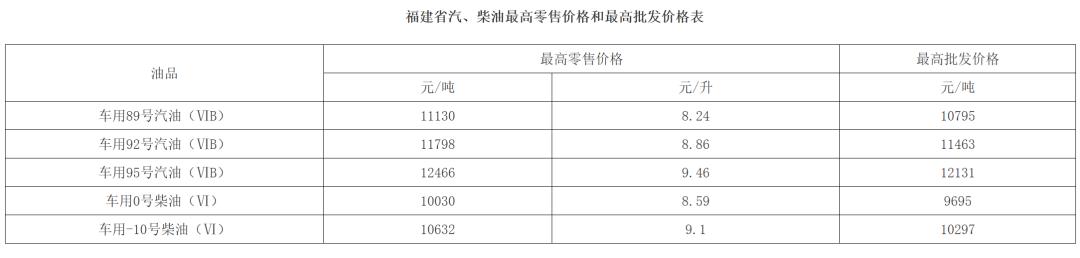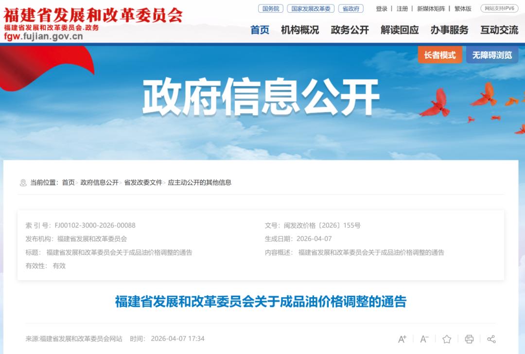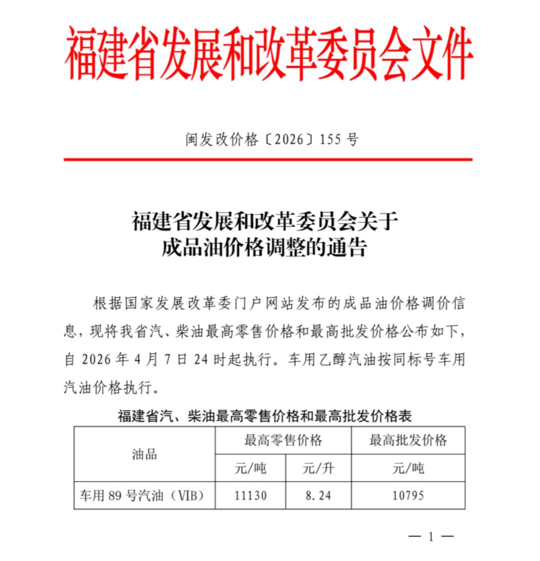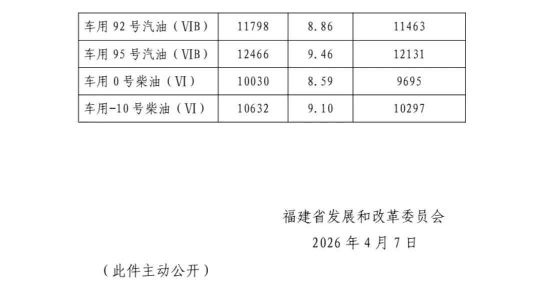 据福建发改:根据国家发展改革委门户网站发布的成品油价格调价信息,现将我省汽、柴油最高零售价格和最高批发价格公布如下,自2026年4月7日24时起执行。车用乙醇汽油按同标号车用汽油价格执行。