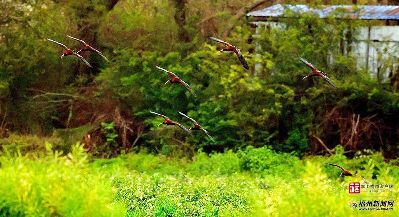 2026年4月6日,9只国家一级保护野生动物——彩鹮现身福州市连江县山堂村上空,这是近年来福建省记录到数量彩鹮最多的一次。