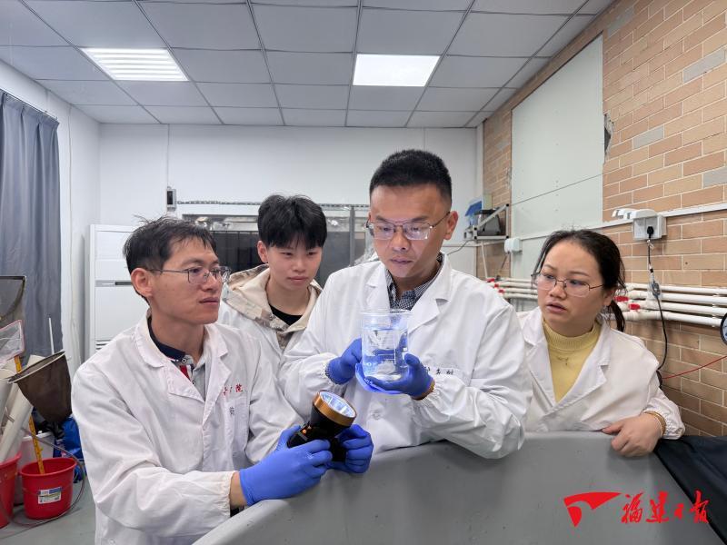 陈仕玺教授(右二)与团队成员正在观察刚出生的仔鱼。