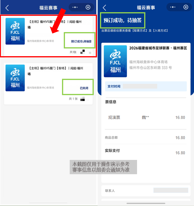 本次闽超赛事实行预订购票制度,购票共四个步骤:用户下单预订→完成支付→参与抽签→接收短信通知出票结果。若中签,则出票成功;若未中签,将全额退款。