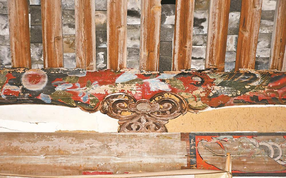 此外,宝峰岩大殿内留有多处精美彩绘,如正殿明间三架梁面层彩绘双狮戏球,五架梁面层彩绘的龙依然清晰,神龛横梁面层由沥粉勾画双龙戏珠,造型活灵活现、栩栩如生。