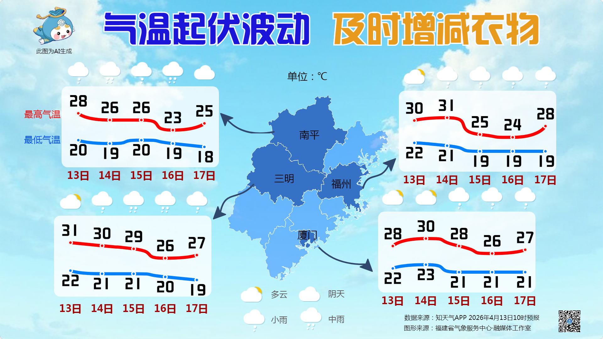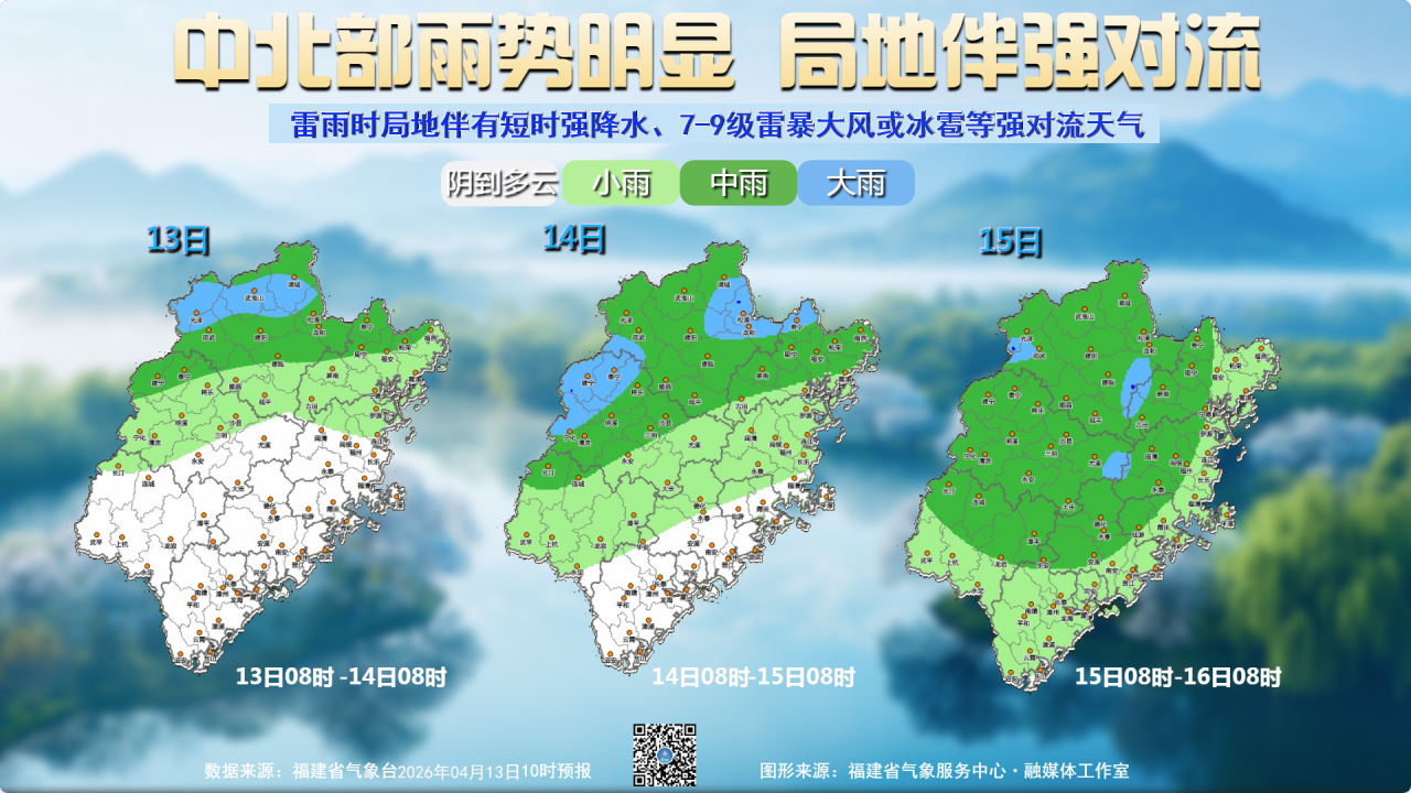 13日,全省阴到多云,中北部有阵雨或雷阵雨,局部大雨到暴雨。