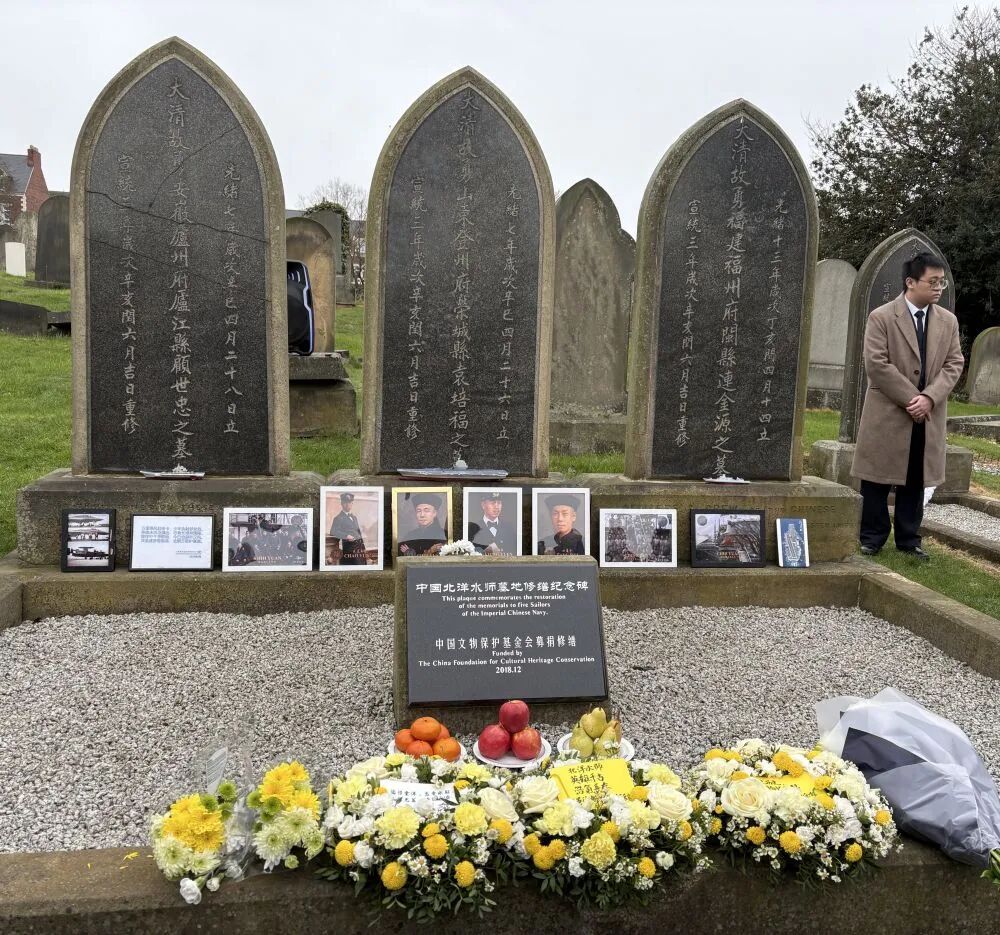 英格兰东北部泰恩河畔,风有点急,雨有些凉。 清明前一天的纽卡斯尔,天空是那种英国北方特有的铅灰色,云层低低地压着,间或飘来几滴雨丝。100多位在英华侨华人与留学生,冒着风雨赶往纽卡斯尔的圣约翰墓园,祭悼追思140多年前长眠在这里的6位北洋水师水兵。仪式简朴、庄重、肃穆。 ![]() 祭悼追思活动现场。吴黎明摄 “明天就是清明节了。”中国驻曼彻斯特总领事唐锐的声音在墓园里显得格外清晰,“今天我们站在远离祖国8000公里的英国纽卡斯尔市,面前有6座遥望华夏的墓碑。” 6座墓碑,朝着东方——那是家的方向。 140多年前,也是这样的泰恩河畔,一群年轻的中国水兵踏上这片陌生的土地。他们是来“接船”的。19世纪80年代,清政府向纽卡斯尔的阿姆斯特朗造船厂订购了“致远”“靖远”“超勇”“扬威”等巡洋舰。 然而,远航劳顿、水土不服、疫病缠身,先后有6名水兵再也没能回家。袁培福、顾世忠、陈受富、陈成魁、连金源、甘肇功,他们的名字被刻在异国的石碑上,被海风吹了100多年。 纽卡斯尔的墓园中埋着“师夷长技”路上倒下的背影。 甲午战争之后,李鸿章踏上了环球访问的旅程。1896年8月,73岁的李鸿章专程北上纽卡斯尔,阿姆斯特朗公司创始人威廉·阿姆斯特朗男爵陪同他参观埃尔斯维克船厂。