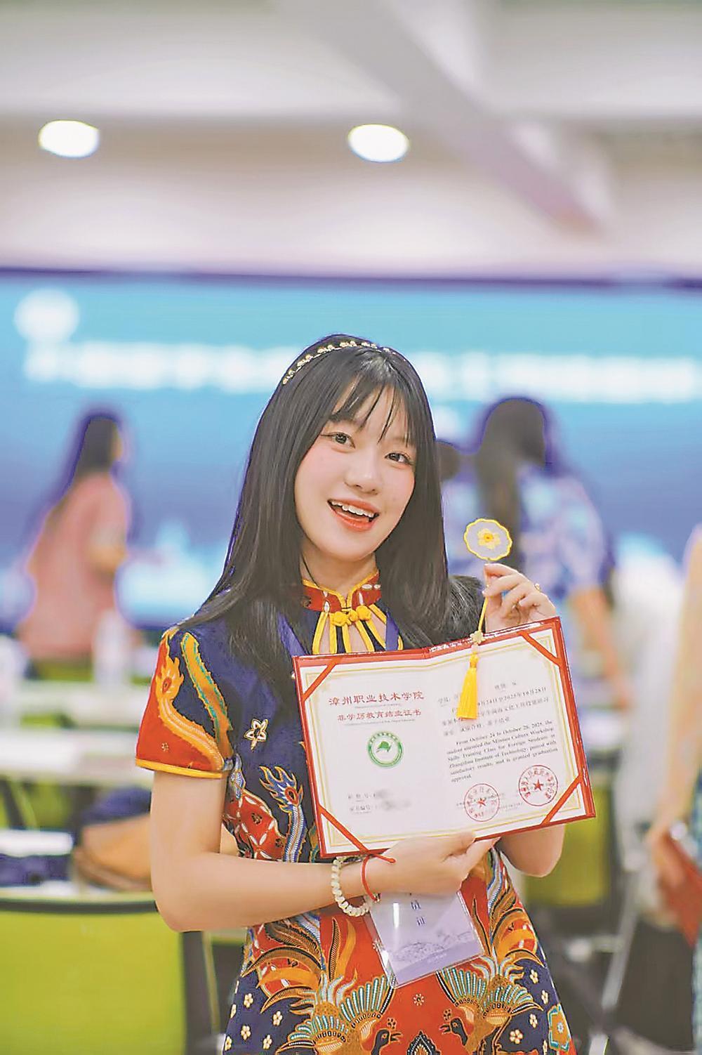 许铭妮完成了漳绣作品,并拿到了职业技能等级证书。