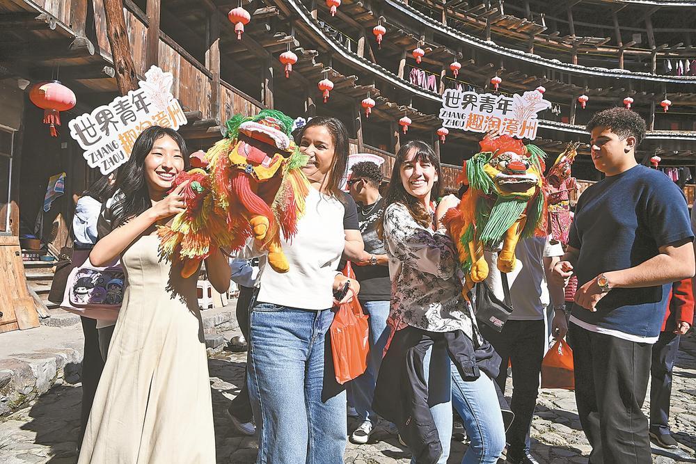 参加“世界青年看福建”活动的外国青年在南靖土楼体验非遗。