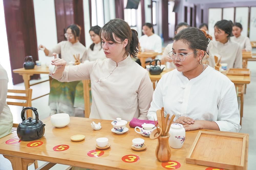 同样来自印度尼西亚的留学生蔡珍美,参加的是茶艺课。她一开始拿茶碗,手被烫得直哆嗦。老师一遍遍地示范,她一遍遍地练,终于能稳稳当当地倒茶,还能把握水温与时间。
