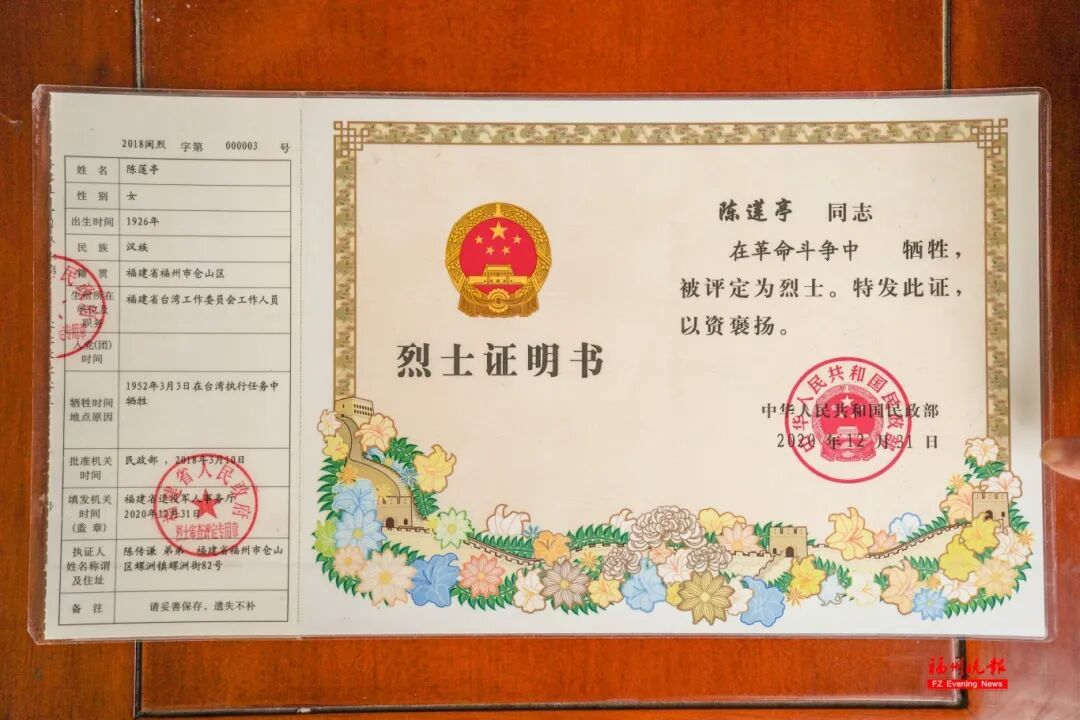 陈莲亭同志烈士证明书。图源:福州晚报