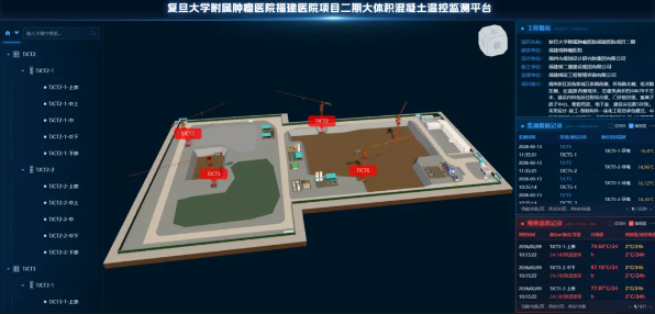 目前大体积混凝土测温系统应用于福州国际人才港(一期)项目、复旦大学附属肿瘤医院福建医院项目二期,实现了大体积混凝土施工全过程动态监控从“监测”到“调控”的闭环控制和三维可视化透明管理。