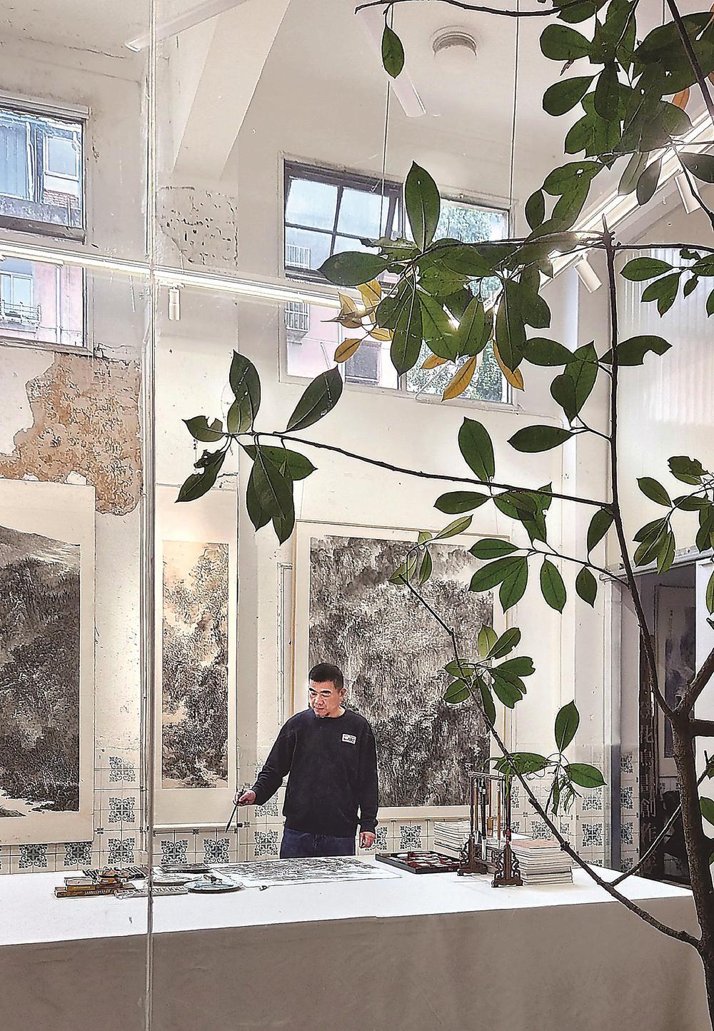 李国雄在由旧厂房“微”改造的工作室创作。