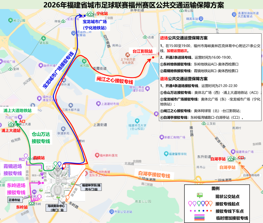 公交方面,4月19日16:00至19:00进场期间,对途经海峡奥林匹克体育中心周边的21条线路加密运营趟次,并开通东岭地铁站、霞镜地铁站至海峡奥体中心西检票口的2条接驳专线;4月19日21:20-22:30退场期间,开通4条接驳专线,分别由海峡奥体中心直达白湖亭、闽江之心、宝龙城市广场、仓山万达广场。