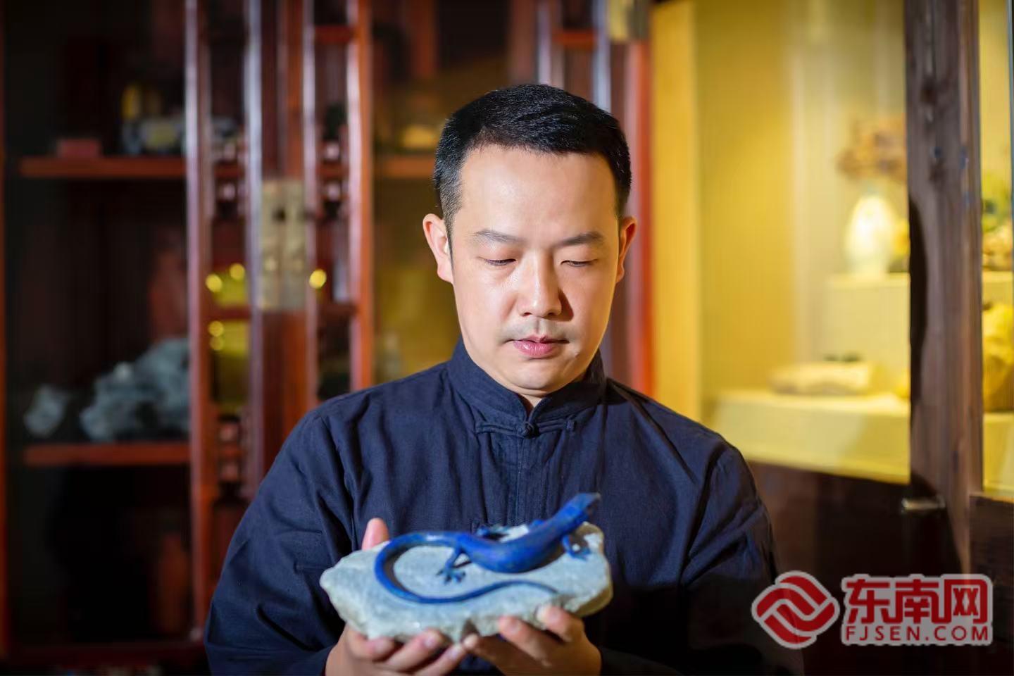 林荣泰展示作品 受访者供图 东南网4月17日讯(本网记者 陈楠 文/图)走进林荣泰的泰渡璞艺工作室,一块块色泽温润的寿山石整齐摆放,刻刀划过石面的细碎声响不绝于耳,展柜里,蜗牛、青蛙、变色龙等石雕作品栩栩如生,仿佛下一秒就要从石上跃下,一个鲜活的“动物世界”就此铺展开来。深耕寿山石雕二十余年,从草虫题材入门,到凭借仿生动物作品名扬业界,再到打造出独树一帜的变色龙、蜥蜴系列,这位非遗匠人用一把刻刀,让方寸璞石绽放出生命光彩。近日,记者面对面专访林荣泰,聆听他刀笔下的匠心与传承。