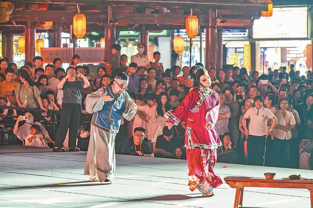 4月17日晚,2026年福建省文旅经济发展大会在漳州古城启幕。此次大会将持续至4月19日,通过策划6场主要活动和60场全省配套系列活动,为民众献上一场“提升文化影响力、展示福建新形象”的文旅盛会。图为漳州市歌仔戏(芗剧)传承保护中心的演员为市民游客表演传统剧目《讨学钱》。