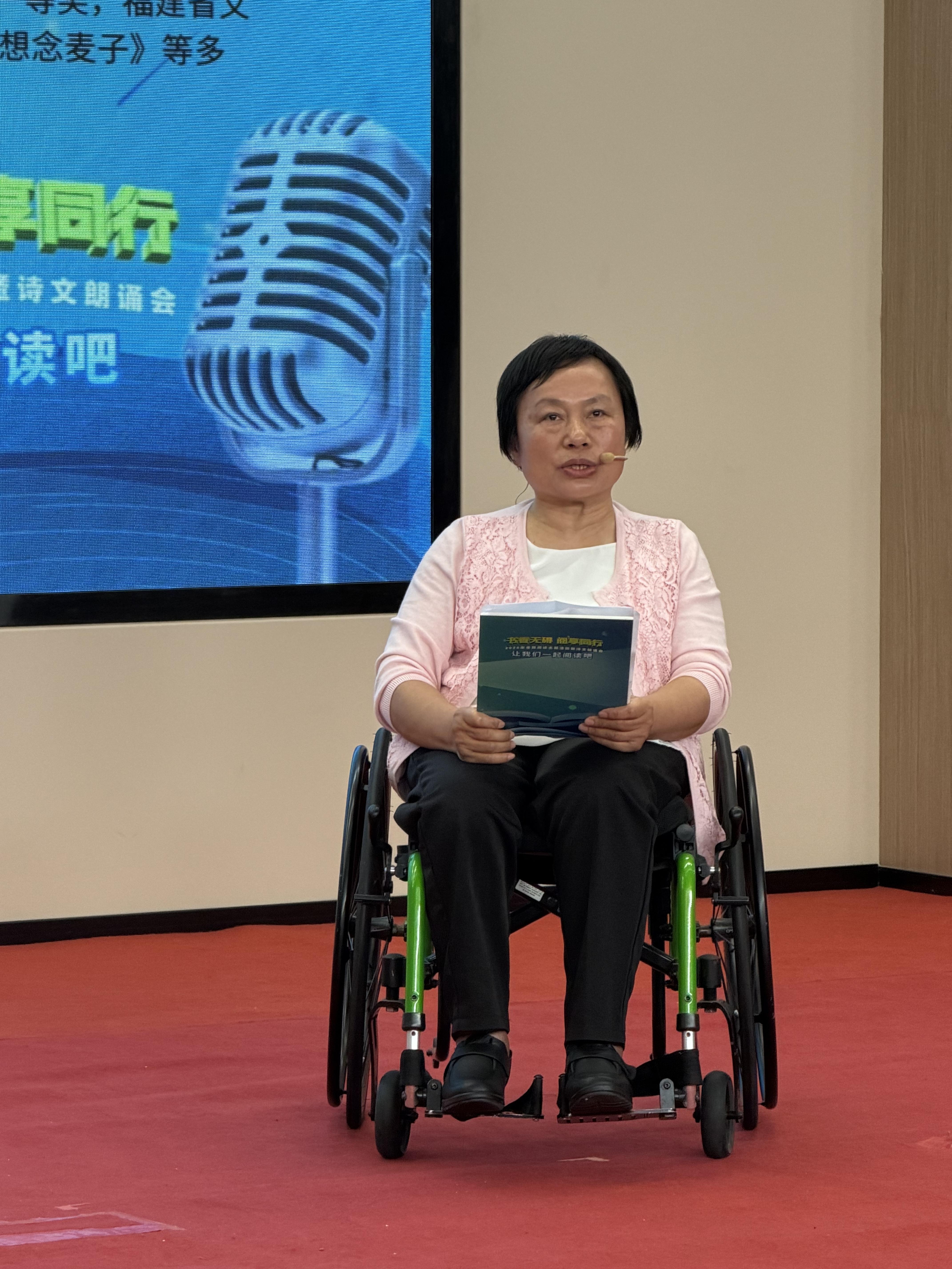 省残联党组成员、副理事长郑海生登台致辞 声韵传情,书香筑梦。现场节目精彩纷呈、温情流转。福建省肢协章文玉、张如玉深情朗诵《同在蓝天下》,以真挚情感传递对生活的热爱与对阅读的坚守;福州海关团委志愿者带来《青春》诵读,字字铿锵尽显青年担当;福建师范大学志愿者朗诵《我在一颗石榴里看见了我的祖国》,家国情怀与书香韵味交融;福州黎明职业技术学院志愿者以《用书页,丈量世界》抒发阅读之志;福州市老年大学金色年华志愿者诵读《锦绣》,用经典讴歌新时代,搭建起跨年龄、残健共融的暖心桥梁。